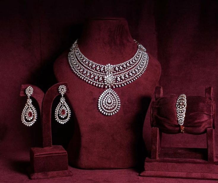 Adorn yourself in unmatched elegance with this breathtaking Victorian-style jewelry set, designed for the modern bride or for any grand occasion. This exquisite collection features a stunning choker necklace, matching drop earrings with a pop of ruby, and a coordinating cuff bracelet, all lavishly studded with brilliant American Diamonds (AD) and finished with a durable, lustrous polish.